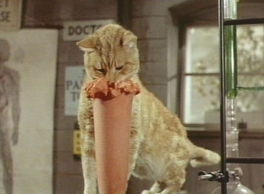 Pero volvamos a Orangey, ganador de dos premios Patsy, el equivalente del Oscar para animales, por «Rhubarb» y «Desayuno con diamantes», las dos grandes películas de su carrera. Sin embargo, se rumorea que Orangey siempre tuvo dobles, aunque Frank Inn jamás quiso reconocerlo. Los gatos no se dejan amaestrar con tanta facilidad como los perros; tampoco imaginamos a un gato dispuesto a repetir la misma toma doce veces… Las malas lenguas dicen que para «Rhubard», Frank Inn llegó a usar hasta 36 gatos anaranjados diferentes y doce para «Desayuno con diamantes». Orangey existió, de eso no cabe duda, pero es muy posible que no fuera uno solo. Catorce años bajo los focos son muchos años para un gato; catorce años aguantando el ajetreo que supone un rodaje, las carreras, el ruido y los gritos hasta el famoso «¡Silencio, se rueda!»