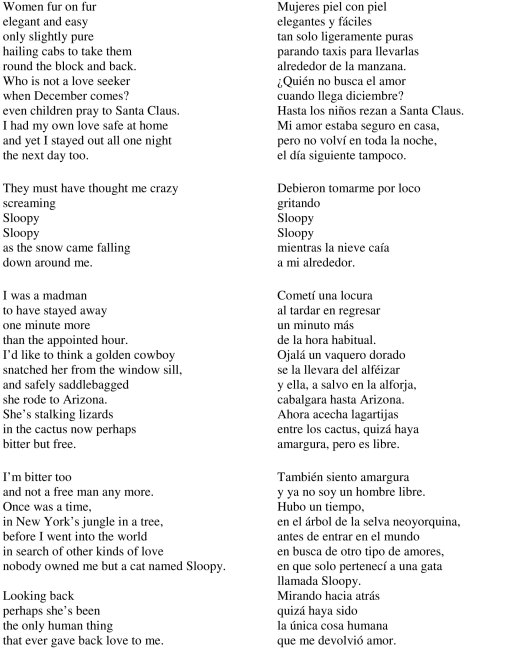 El cantante y poeta estadounidense Rod McKuen adoraba a los gatos y dedicó un largo poema a una gata llamada Sloopy. En una entrevista realizada el 30 de diciembre de 1969 en el «Mike Douglas Show», el presentador le preguntó por el poema y Rod McKuen contestó que, en realidad, era la combinación de dos gatos, un macho llamado A Marvellous Cat y una hembra totalmente sorda con un ojo amarillo y otro azul llamada Sloopy. Añadió que lo pasaba realmente mal en Nueva York y que en el poema introdujo el término «vaquero de medianoche», el mismo que unos años después daría título a la famosa película. El poema, de una desgarradora sinceridad, se publicó en 1967.