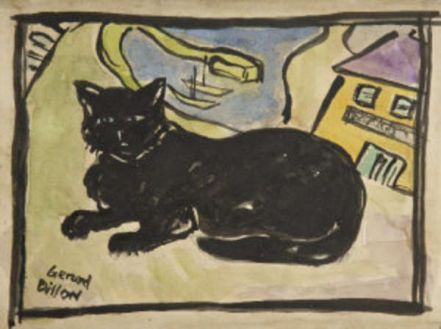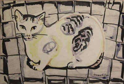 Nos extraña que haya tan poca información en Internet acerca de uno de los pintores contemporáneos más famosos de Irlanda y, desde luego, no hay la menor mención a su relación con los gatos. Sin embargo, Gerard Dillon los pintaba. Añadía gatos a escenas cotidianas, como en el famosísimo cuadro «The Yellow Bungalow» (La cabaña amarilla), en el que se ve a un gato blanco con manchas grises durmiendo plácidamente en primer plano en el cojín azul de la butaca, o en «El gato de Connemara», donde un gato vuelve a estar en primer término, tumbado en la hierba, mientras alguien se asoma por una puerta. Vuelve a verse a un gato sentado en «Gato en silla de enea» y a otro (¿el mismo que en «La cabaña amarilla»?) en el regazo de una mujer en el cuadro «Niña maravillada».