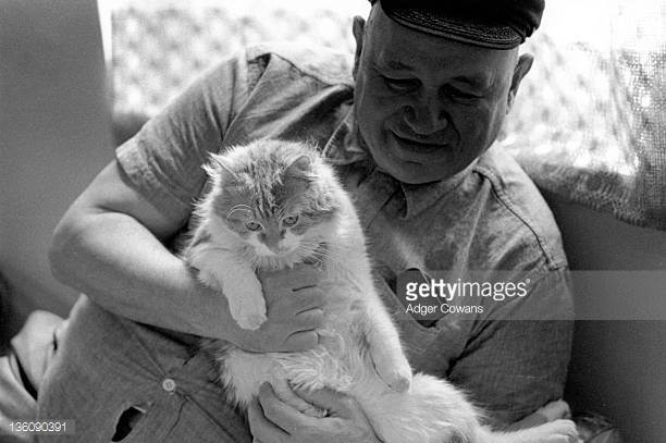 Y sigue diciendo: «Es un gato muy guapo. Pronto cumplirá seis años. Sus rayas son perfectamente simétricas. Le encontramos en el bosque cuando era muy pequeño y debe de haber algo de gato salvaje en él. Tardó unos seis u ocho meses en acostumbrarse a la casa, pero ahora es feliz, se ha apoderado de mi estudio, es suyo».