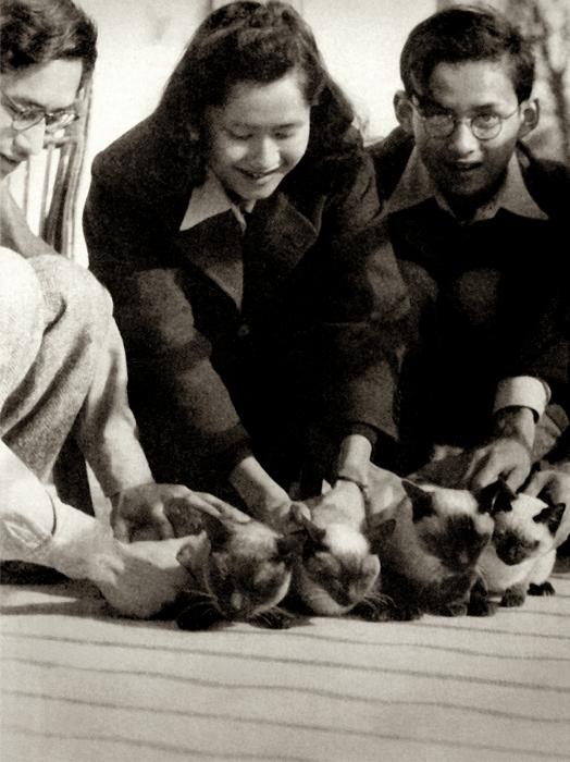 Aunque el consulado de Siam en Londres en el siglo XIX se empeñaba en decir que la familia real no tenía gatos siameses, hubo un rey tailandés que desmintió esa afirmación. Se trata de Bhumibol Adulyadej, que subió al trono en 1946 y reinó hasta su muerte en 2016, convirtiéndose en el monarca con el reinado de mayor duración. Sucedió a su hermano Ananda Mahidol, muerto de un disparo fortuito. En una foto les vemos a los dos con su hermana Galyani Vadhana y varios gatitos siameses.