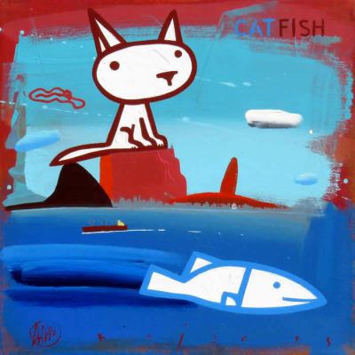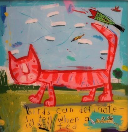 Suele usar pinturas acrílicas, y una vez acabado el cuadro, lo invierte sobre una plancha de cristal. Sus obras son alegres, muy coloristas, divertidas, con un toque de ironía, aparentemente sencillas, como el de la niña sentada encima de un enorme gato pelirrojo con la frase: «Sé de una niña que adora a los gatos». A menudo juega con el idioma, como por ejemplo en el cuadro llamado «Catfish», cuya traducción literal es «Pez gato», pero el significado real es «Bagre». En un lienzo con dos caras femeninas, una muy al estilo cubista picassiano y la otra mucho más sencilla y sonriente, demuestra tener sentido del humor añadiendo la frase: «No soy Picasso»; y más abajo: «Sé dónde van los ojos».