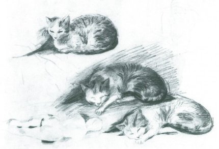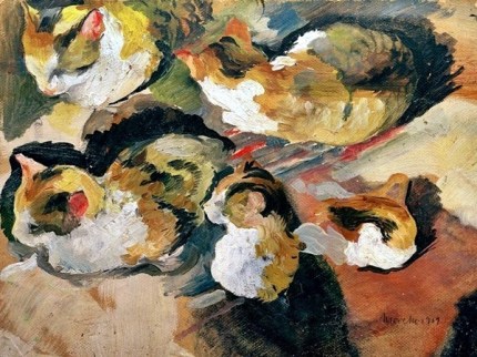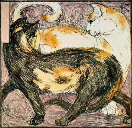 Hemos encontrado seis obras de August Macke representando a gatos. Puede que estemos equivocados, pero mirando los cuatro cuadros con atención (no los dos dibujos), nos parece que todos son de la misma gata. ¿Sería su gata? Y gracias a Macke, sabemos que Franz Marc tuvo dos gatos, como demuestra uno de sus dibujos. Nos ha sido imposible encontrar más información sobre los gatos de los dos artistas.