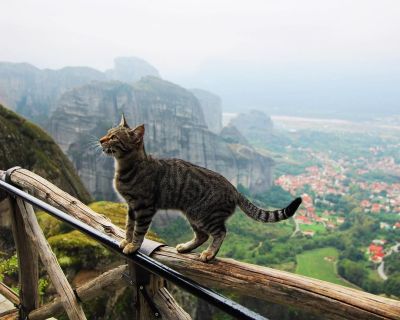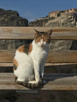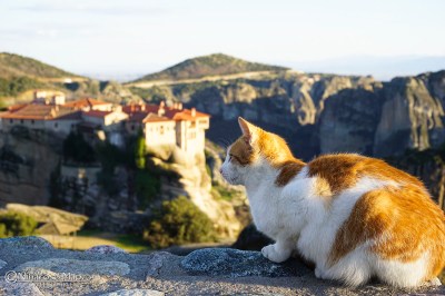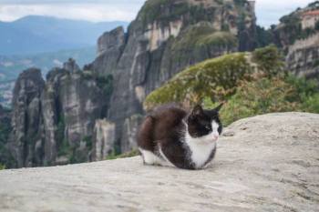 En el centro de Grecia hay varios monasterios construidos en extrañas formaciones rocosas que se asemejan a enormes columnas donde viven gatos, además de monjes y monjas. Los gatos no son propensos al vértigo, menos mal. Desde los años veinte del siglo pasado se accede a los monasterios mediante escaleras talladas en la roca, pero no siempre fue así. No hemos podido enterarnos de si había gatos anteriormente a la construcción de las escaleras, pero es muy probable y tal vez fueran transportados hacia las alturas en cajas cerradas mediante el sistema de poleas que usaban los monjes.