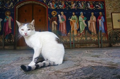 Pocas son las personas que visitan Grecia y no vuelven con fotos de gatos, sobre todo de Creta, Santorini… Gatos en muros blancos con un mar azul de telón de fondo. No parecen temer a los turistas ni tampoco estar hambrientos. Los griegos no tienen problemas con los gatos, pertenecen a todos y se les deja comida, aunque solo sean restos. Suelen aparecer en los puertos a primera hora de la mañana, cuando vuelven los barcos de pescadores. Los gatos en las islas se benefician de un clima templado y se les considera muy útiles porque no solo alejan a las ratas, también matan a los escorpiones y a las serpientes.