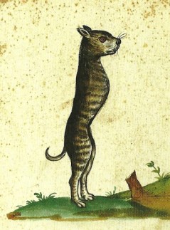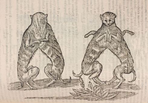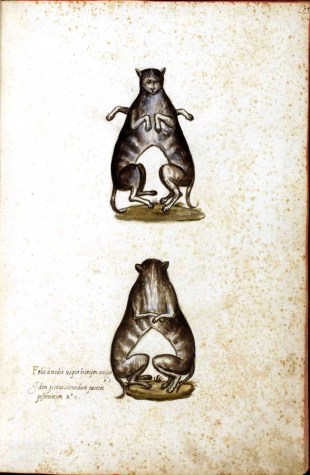 Puede sorprender el dibujo del gato de pie sin patas delanteras, pero encontramos otro similar de un perro. Algunos animales nacen sin patas delanteras o traseras, y Ulisse Aldrovandi se dedicó a observar la naturaleza personalmente. Incluso reprochó a los “antiguos” que no describieran con detalle a los animales que Alejandro Magno trajo de sus conquistas.