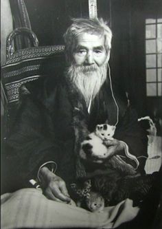 No hay duda de que amaba a los gatos y de que algunos de sus cuadros eran retratos de los que le rodeaban. Las fotos demuestran que vivió con gatos en diferentes épocas. En una no debe tener más de 65 años y está sentado con un bobtail japonés en las rodillas. Ese mismo gato duerme a su lado en otra foto. Años después volvemos a encontrarle sentado con tres gatitos, dos de ellos a su lado y otro en su regazo.