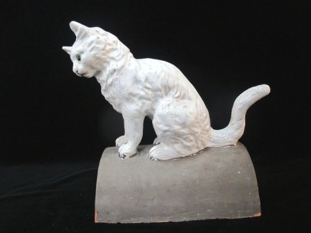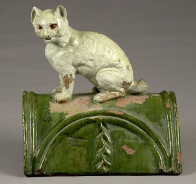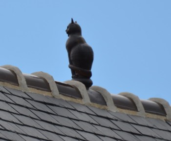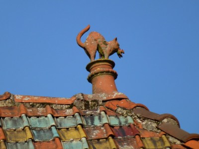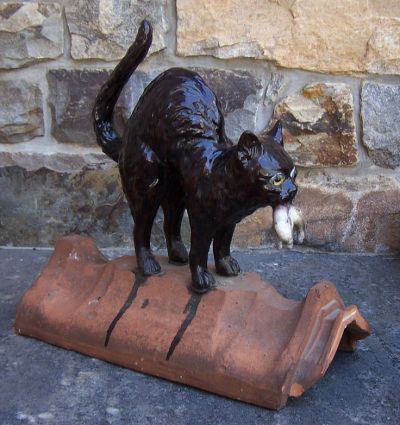 En realidad deberíamos titular esta entrada “Gatos de cerámica en tejados” ya que nos referimos a las piezas decorativas en forma de gato que se colocan en los tejados. Las hay de dos tipos, el fastigio propiamente dicho, que marca la parte superior o el final de algún elemento arquitectónico, y la teja decorativa. También llamados remates de pináculo o espantabruxas, en España son poco frecuentes y casi inexistentes los que representan a un gato. Solo hemos encontrado un ejemplo encima de una chimenea en el pueblecito de Fiscal, en Huesca.