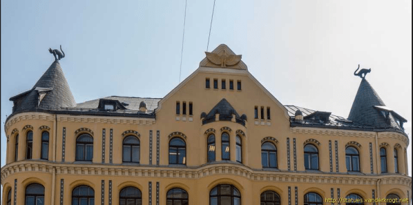 Muy al norte de Europa, en Riga, capital de Letonia, encontramos otra famosa “Casa del Gato”, construida en 1909 según los planos del arquitecto Friedrich Scheffel. Es famosa por las esculturas de dos gatos idénticos en hierro fundido, con la espalda arqueada y el rabo tieso, cada uno coronando un torreón.