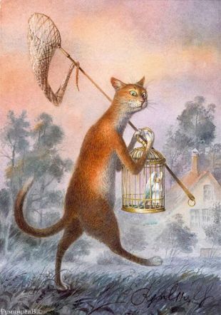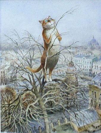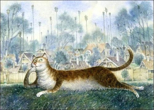 Siente una inclinación muy especial por los gatos, a los que pinta con un enorme sentido del humor en escenas poco habituales (para gatos). No puede decirse que sean antropomorfos, pero sí se encuentran en situaciones sorprendentes. Del mismo modo que el folclore ruso está lleno de historia de gatos, a los de Vladimir Rumyantsev les rodea una marcada aura de cuento de hadas.
