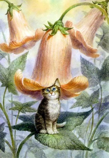 Los gatos se han convertido en la inspiración de Vladimir Rumyantsev, que usa sobre todo pasteles para reproducirlos y darles un toque mágico. Entre los numerosos gatos que ha pintado, uno de los más divertidos tiene una vaca en las rodillas y está rodeado de apetitosas fresas. ¿Qué relación puede haber entre un gato y las fresas? Bueno, la autora francesa Colette, a la que dedicamos una entrada la semana pasada, dice en “Les chats de Colette” que el Long-chat (el Gato Largo) de su madre escogía las fresas más maduras del jardín y se las comía. Este quizá también haga lo mismo.