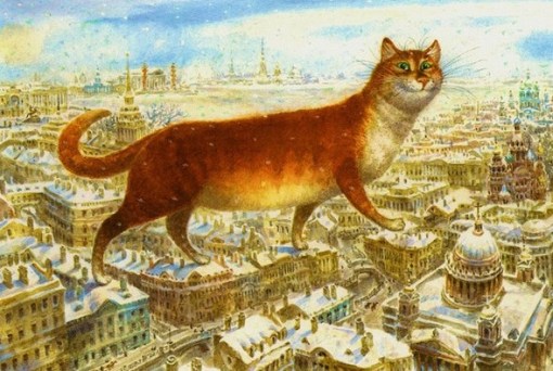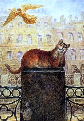 Uno de ellos saluda a Aleksandr Pushkin cuando se cruzan en la calle y otro está sentado en el regazo del gran escritor cuando este trabaja. Dicen que Pushkin era un gran amante de los gatos. Desde luego, los menciona en sus escritos. Habla de gatos gordos sentados en alfombras dándonos la espalda, con el rabo enrollado alrededor del cuerpo.