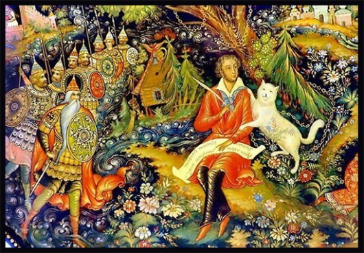 Pero el más famoso de todos los gatos de Pushkin aparece en este poema: “Cerca del mar crece un verde roble / con una cadena dorada a su alrededor; / Atado a la cadena un gato erudito / lo rodea día y noche. / Si va a la derecha, canta una canción; / si va a la izquierda, cuenta un cuento”. Después de este breve prólogo, el narrador dice haber estado en un lugar mágico donde conoció al gato erudito y que este le confió los famosos cuentos de hadas que reprodujo en verso con el título de “Una cabaña sobre patas de gallina” o “Baba Yaga”. Los gatos de Vladimir Rumyantsev saludan al gran autor ruso y trabajan con él.