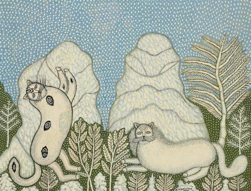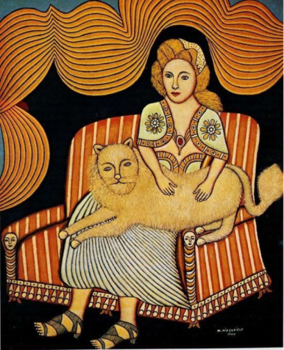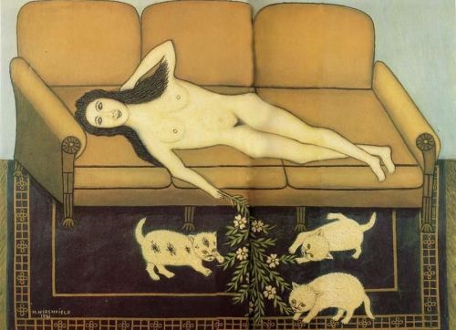 Numerosos artistas considerados “marginales” u “outsiders” se sintieron atraídos por los animales, los gatos entre ellos, como ocurrió con el estadounidense Morris Hirshfield. Nacido el 10 de abril de 1872, en la entonces Polonia rusa cerca de la frontera alemana, exactamente cien años antes de que naciera el término “outsider art”, está considerado uno de los mejores, quizá el mejor, de todos los naifs norteamericanos.