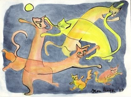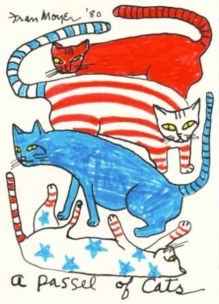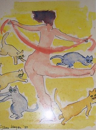 Los gatos de Fran Moyer demuestran que los conocía bien y los observaba. Son alegres, cómicos en ocasiones, pero siempre se comportan como auténticos felinos. También se nota que la pintora los quería y estamos seguros de que siempre tuvo, pero no había llegado el momento de retratarlos antes del año 80, cuando creó toda una serie de dibujos con todo tipo de gatos, incluso una mujer desnuda bailando con ellos.