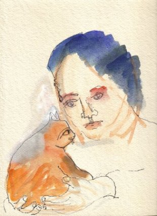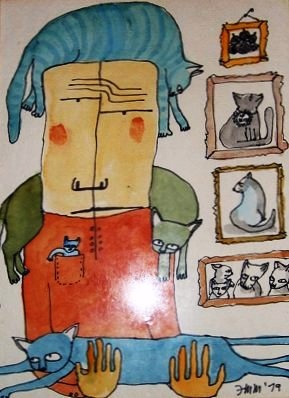 Pero el primer cuadro con un gato es de 1979, un retrato de una mujer llamada Sandra Hawthorne con gatos callejeros. Sandra tiene un gato alrededor de los hombros, otro en los brazos y un tercero en el bolsillo de la blusa. Además, hay varios retratos de gatos en la pared.