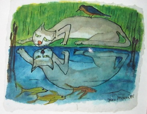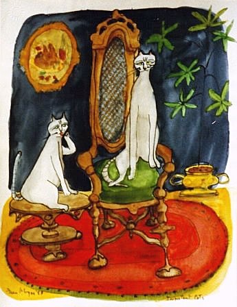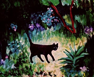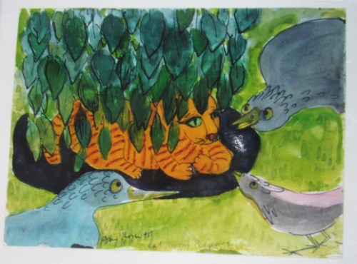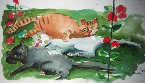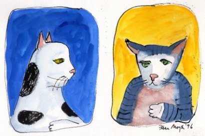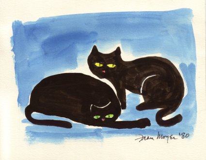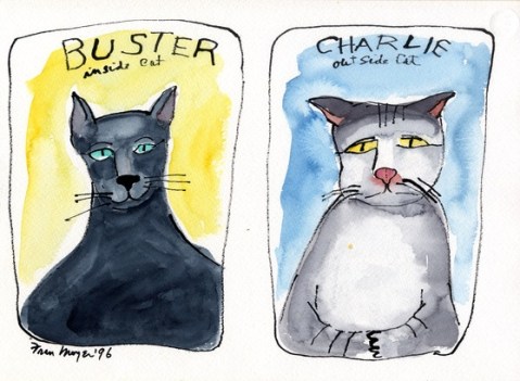 A partir de 1980 – transcurridos más de 30 años desde el Tomcat – Fran Moyer empezó a pintar gatos. ¿Por qué dedicó de pronto tantas acuarelas a gatos? Los suyos, Charlie (el de fuera) y el negro Buster (el de dentro) no aparecen hasta finales de la década de los noventa, como ocurre con Madge y Kate. Casi nos atrevemos a pensar que otra residente en Mendocino, Dorr Bothwell (https://gatosyrespeto.org/2018/08/23/gatos-y-la-pintora-californiana-dorr-bothwell/), influyó en ella, nunca se sabe…