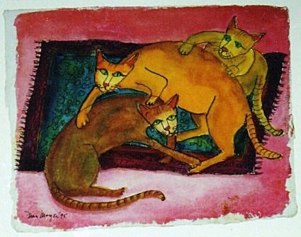 Si nos fijamos en la composición realizada en 1995 donde tres gatos intentan caber en una alfombra verde, veremos que el del centro ha ocupado el mejor sitio; el de más abajo no cabe, tiene la mitad del cuerpo fuera, y el de más arriba está sentado, intentando hacerse un hueco. Todos los que tenemos varios gatos (tres o más) sabemos que esto ocurre habitualmente si hay un sitio favorito.