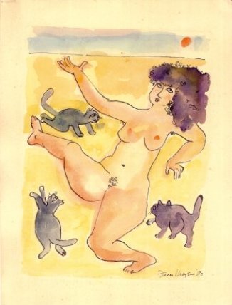 Los gatos de Fran Moyer demuestran que los conocía bien y los observaba. Son alegres, cómicos en ocasiones, pero siempre se comportan como auténticos felinos. También se nota que la pintora los quería y estamos seguros de que siempre tuvo, pero no había llegado el momento de retratarlos antes del año 80, cuando creó toda una serie de dibujos con todo tipo de gatos, incluso una mujer desnuda bailando con ellos.