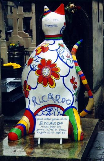 La artista siempre le comparaba a un gato; le parecía un hombre orgulloso, misterioso y sensual. Fue a verle en cuanto supo que estaba en el hospital y le prometió que realizaría una escultura de gato en su honor y que la colocaría en su tumba. A Ricardo le gustó la idea y Niki se encargó de encontrar un lugar adecuado, concretamente el cementerio de Montmartre. Delante de la escultura, grabado en una piedra, se lee: “A nuestro gran amigo Ricardo, que falleció demasiado joven, amado y apuesto”. Niki reprodujo la estatua para colocarla en el Jardín del Tarot y tenerle siempre presente.