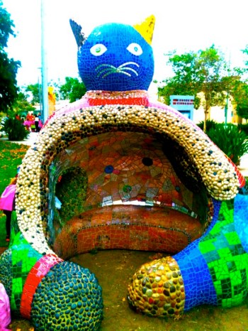 Niki de Saint Phalle tenía tendencia a realizar esculturas de gran tamaño y hay gatos suyos diseminados por el mundo, como el “gato tiesto” en la isla de Naoshima, Japón. También hay gatos banco, gatos para jugar al escondite. Son animales sonrientes, felices, incluso el gato Ricardo está lleno de alegría.