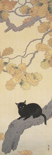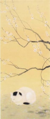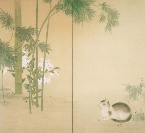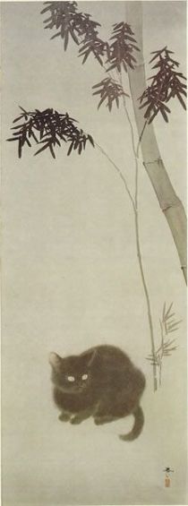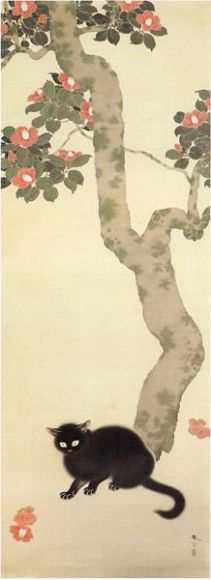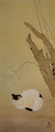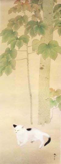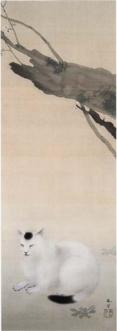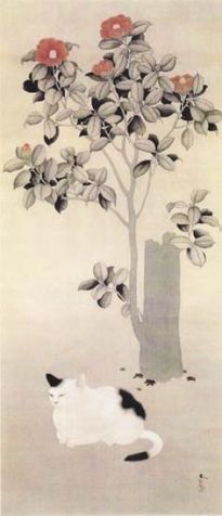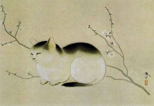 Los gatos de Shunsō Hishida son delicados, casi etéreos. En el detalle de “Gato bajo ciruelo”, la delicada pincelada deja entrever los pelos del animal. En realidad se llamaba Miyoji Hishida, pero adoptó el seudónimo de Shunsō. Lo curioso es que ninguno de los numerosos gatos que pintó son bobtails japoneses (https://gatosyrespeto.org/2018/10/25/el-gato-bobtail-japones-su-historia/); como puede verse en los cuadros que reproducimos, todos tienen el rabo largo.