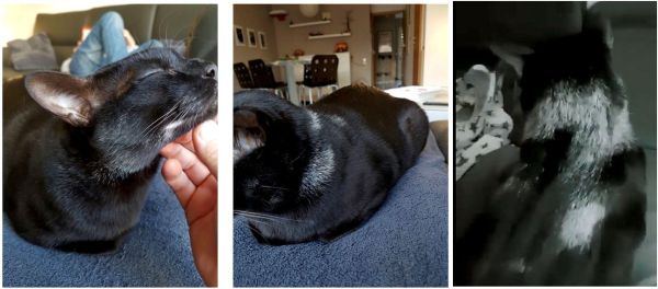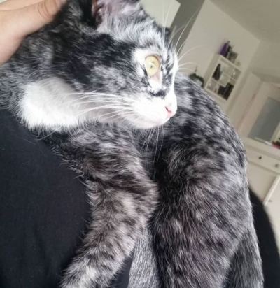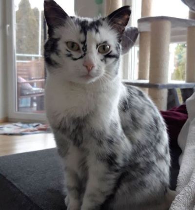 El vitíligo es una forma de leucoderma, algo que antes se creía muy poco común en gatos, pero gracias a las redes sociales e Internet, cada vez salen más casos a la luz. La leucoderma (piel blanca) y leucotriquia (pelo blanco) producen un efecto “tela de araña” o “copo de nieve” más obvio en gatos negros. Algunos pueden acabar casi totalmente blancos con el paso del tiempo con solo pequeñas manchas negras dispersas. Como hemos dicho antes, no es una condición restringida a los gatos, también se ve en perros y panteras negras, entre otros animales. Es algo meramente cosmético y no afecta a la salud aunque incrementa la posibilidad de quemaduras solares en las zonas despigmentadas.