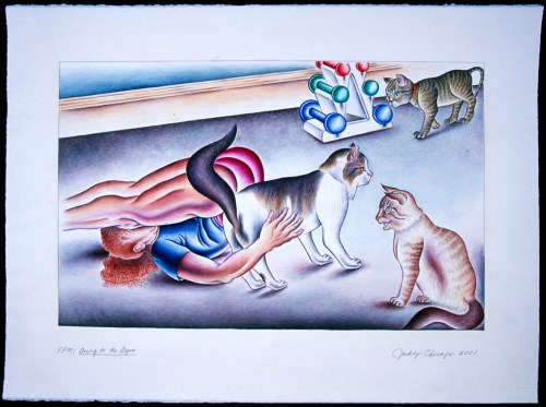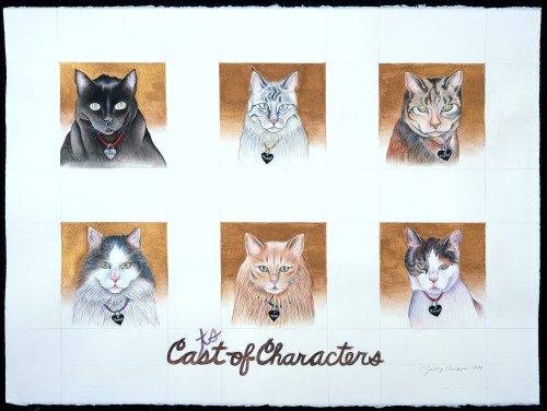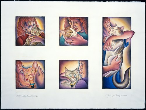 En “Kitty City”, Judy Chicago cuenta que, de pequeña, no tuvo animales domésticos. Más aún, era alérgica a los gatos con los que se cruzaba en casa de amigos o conocidos. Cuando vivía en Santa Mónica y estudiaba en UCLA, “una diminuta gata negra llegó a mi puerta y me enamoró. Habría hecho cualquier cosa para quedarme con Little Puss, y conseguí superar la alergia. Desde entonces, casi siempre he vivido con gatos”.