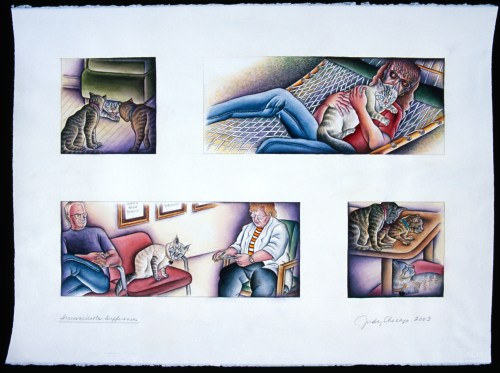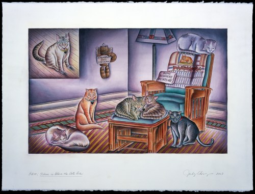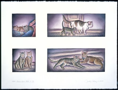 Las personas que conozcan la obra de Judy Chicago quizá no sepan que en 2005 publicó “Kitty City”, según ella “su proyecto más modesto”. En el libro habla de todos los gatos con los que convivió, aunque los protagonistas solo son seis, Inka, Milagro, Poppy, Romeo, Trio y Veronica. Al ser un libro de horas, contiene 24 acuarelas correspondientes a cada hora del día describiendo una ocupación felina, además de otras planchas hasta un total de 36.
