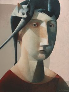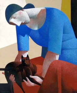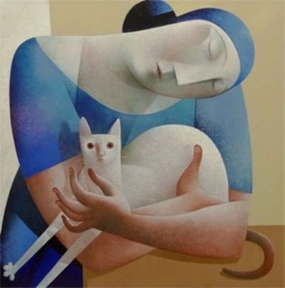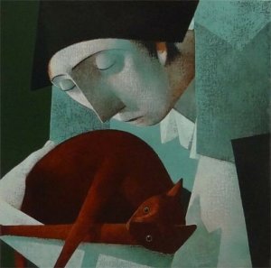 Los gatos que están solos, sin la compañía de un ser humano, son igual de elegantes, pero tienden a una ligera humanización. Y todos, a pesar de ser sumamente estilizados, adoptan posiciones muy habituales en ellos. Nos da la impresión de que el pintor ha pasado tiempo observándolos y casi nos atreveríamos a decir que, en algún momento, debió convivir con alguno o algunos.