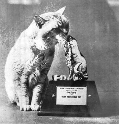 El trofeo dorado, al lado del que vemos a Morris, ofrecido por 9Lives al gato del año durante un concurso celebrado en el Beverly Hills Hotel, estaba hecho por la empresa que también fabricaba los premios Emmy, algo que demuestra la importancia de Morris.