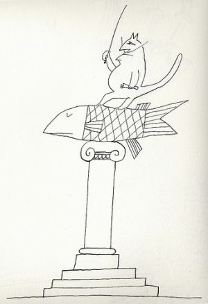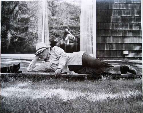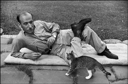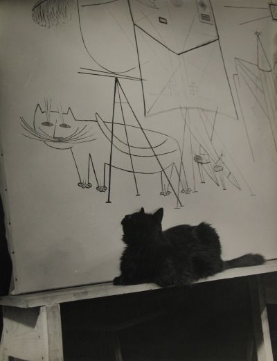 En 1947, Henri Cartier-Bresson fotografió a Saul Steinberg en Vermont con un gatito, y ese mismo año, el artista pintó un mural en el estudio del fotógrafo Gjon Mili (https://gatosyrespeto.org/2016/03/31/el-gato-blackie-y-el-fotografo-gjon-mili/) donde se ve a Blackie – el gato fetiche de Gjon Mili -, en la esquina izquierda inferior.
