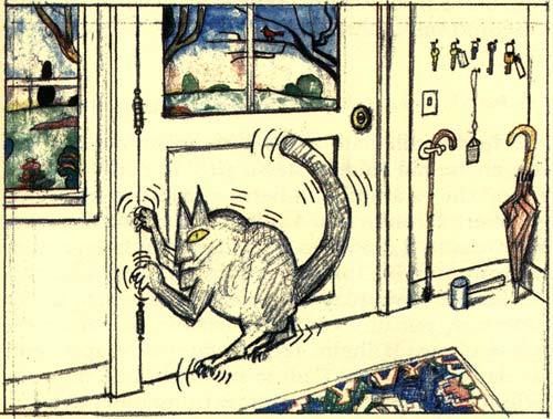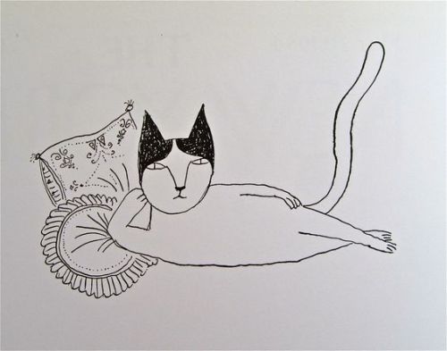 Con el tiempo, los gatos redondeados del principio se harían más angulosos, más irónicos e incluso mucho más antropomorfos, como “La esfinge”. El cuerpo seguía siendo el de un gato, pero en muchas viñetas, la cabeza se convertía en geométrica, con facciones humanoides.