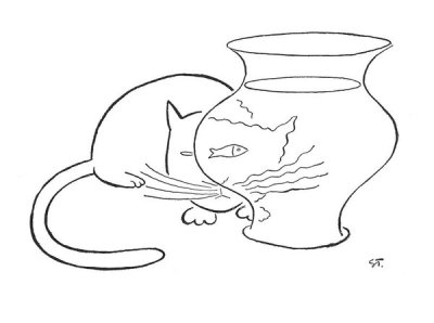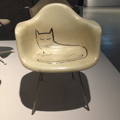 Tres años después encontramos tres representaciones felinas totalmente diferentes: la famosa silla “gato” de fibra de vidrio diseñada por el matrimonio Eames y pintada por él; “Retratos”, una fotografía publicada en la revista “Flair” de unas banquetas simulando el cuerpo de gatos con las cabezas y las patas pintadas en paredes y suelo, y finalmente, la viñeta publicada en The New Yorker del gato detrás de la pecera.