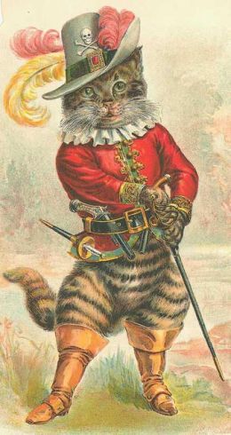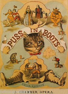 La primera vez que aparece un gato en un cuento para ayudar a un ser humano es en 1550, en una colección de cuentos escritos o recopilados por Giovanni Francesco Straparola en dos volúmenes titulados “Piacevoli notti” (Noches placenteras). Durante cada una de las trece noches del Carnaval de Venecia se contaban historias. La undécima noche, Fiordiana les cuenta a sus compañeros la historia de “Constantino Fortunato”. Una mujer que tenía tres hijos muere y deja al mayor una artesa para amasar el pan, al mediano una tabla para estirar la pasta, y al último, un joven llamado Constantino, su gato. Los dos mayores prestan la artesa y la tabla a los vecinos, que les pagan con comida, pero no la comparten con su hermano menor y le dicen que se la pida al gato.
