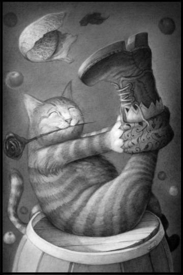 Deciden que se presentarán como “cazarratas” una vez que Atigrada haya esparcido ratas medio muertas por la casa. La vieja criada, aterrada, les hace pasar y la doncella la convence para que la deje a solas con los “cazarratas” en su dormitorio. Los dos jóvenes hacen el amor apasionadamente mientras Gato simula cazar. Cuando entra la vieja y pregunta por qué está deshecha la cama, el joven le dice que Gato ha librado una terrible batalla con una rata enorme.