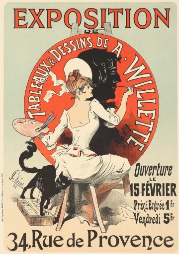 Hasta febrero de 1888 no pudo exponer en solitario. Como puede verse por el cartel de Hérel, Willette estaba unido a la imagen de un gato negro. Queda por saber si se debía a que era un asiduo del cabaret Le chat noir o si le gustaban los gatos. A partir de entonces dibujó sobre todo para anuncios y para la prensa. En sus numerosas colaboraciones con el periódico Courrier français, firmaba artículos con el seudónimo C Lechat, lo que suena como “C’est le chat” (Ha sido el gato).