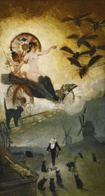 También en esa época pintó “Venus pasando delante del sol”, posiblemente un encargo de Le chat noir, donde se ve a Pierrot, el doble de Willette, rodeado de gatos negros y enseñando sus bolsillos vacíos. En la parte superior hay otro gato negro en el ala de un molino formada por notas musicales.