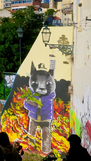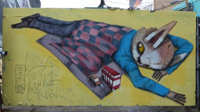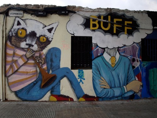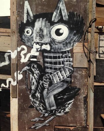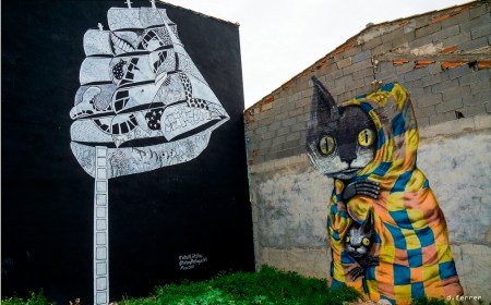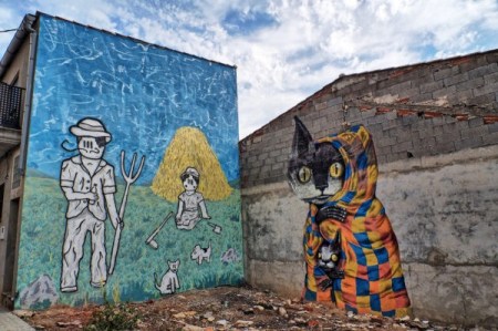 Desde entonces, cada mes de julio, varios artistas urbanos acuden a Fanzara a pintar paredes, y miles de visitantes desfilan por el pueblo para admirar el museo al aire libre. Pero por falta de espacio, las obras tienen un plazo de vida determinado y son sustituidas cada equis tiempo, como lo demuestra el mural a la izquierda del gato de Thiago Goms. No sabemos cuál fue primero, si el barco o el granjero.