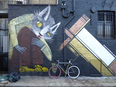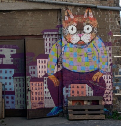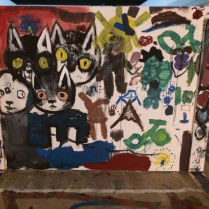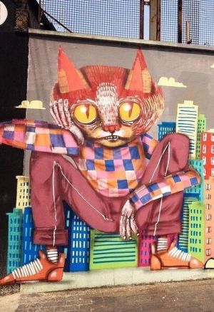 Los hay de todos los tamaños. Algunos son enormes y cubren la pared de un edificio de cinco pisos, aprovechando para sentarse en otro edificio pintado. Otros aparecen en tapias de jardines o en el muro exterior de una casa. También pinta acuarelas y tintas chinas. Pero siempre gatos.