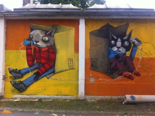 Los retrata en todas las ciudades que cruza y en todas las superficies que encuentra. Son gatos de cuerpo humano, el cuerpo algo desgarbado de un adolescente a punto de dejar de serlo, de manos largas y dedos finos, de rostro curiosamente expresivo, a pesar de su sencillez. Visten ropa muy colorida y se aplican a multitud de quehaceres. Son gatos amables, pero algo melancólicos.