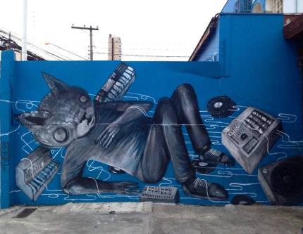 - Cuando haces graffiti lo normal es colaborar con otros artistas. Aunque últimamente intento trabajar en solitario para entender mejor mi obra y crear algo nuevo. Me gusta encontrarme con artistas y crear una atmósfera usando técnicas diferentes, como cuando pinto con mi amigo Emilio Cerezo en España. Nuestras creaciones no tienen nada que ver, pero es genial. O también colaborar con mi amigo Lobot, de Sao Paulo, que hace obras abstractas.