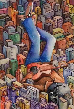Thiago Goms nació en Sao Paulo, Brasil, en 1984. Al principio trabajaba con sprays, pero se pasó al acrílico porque cree que se aproxima más a la sensación que comunica una obra en un lienzo. Cuenta que, de pequeño, solía andar mucho por el centro de la ciudad y le fascinaba el arte urbano que veía en las paredes ciegas de los edificios. Se preguntaba quiénes eran los autores y cómo conseguían hacerlo.