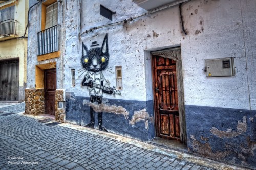 La gente del pueblo estaba encantada. Al año siguiente, en 2015, se celebró la segunda edición, y Santiago Goms pintó un espléndido mural de un gato protegiéndose bajo una capucha y escondiendo a otro más pequeño.