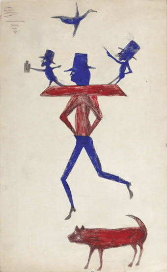 Aunque Bill Traylor jamás aprendió a escribir, alguien debió enseñarle a firmar porque en algunos cuadros está su nombre en letras grandes. Muchos de sus personajes llevan un sombrero de copa que recuerda al del famoso Baron Samedi, el loa de la muerte de los ritos vudú. También parecen señalar con el dedo índice, ¿o se trata de un cuchillo? Hay gatos enmascarados, gatos moteados, gatos que no parecen gatos…
