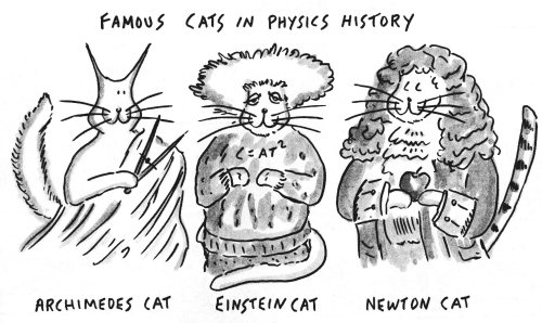 Gatos famosos en la historia de la física gatuna: Gato Arquímedes, Gato Einstein, Gato Newton.