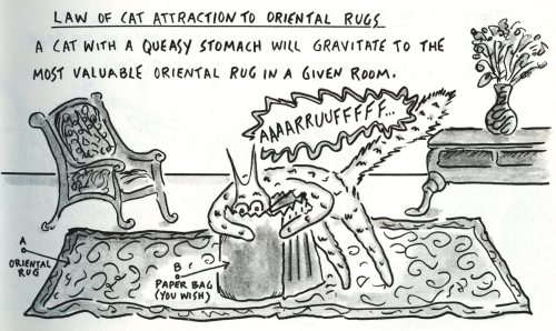 Ley de la atracción gatuna por las alfombras persas: Un gato con el estómago revuelto siempre gravitará hacia la alfombra más cara de la casa.