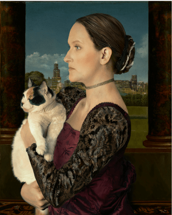 “Varias mujeres recibieron la felicitación y me pidieron un retrato con su gato. Seguía sin pensar en una serie basada en retratos clásicos con gato añadido, pero supe inmediatamente que el siguiente vendría del renacimiento italiano porque pasé un año en Florencia cuando estudiaba Historia del Arte. Había disfrutado plasmando a Andrea con toda su fuerza, lo opuesto de un retrato maternal. Y me di cuenta de que podía trastocar el insultante término de “Cat Lady”, la mujer de los gatos, que suele ir acompañado del epíteto “vieja” o “loca” y, a la vez, reinterpretar la forma en que se ha retratado a la mujer en la historia. El segundo retrato fue el de Lindsey Tyler, una productora de la agencia de publicidad FCB. En este retrato, en vez de un paisaje toscano, integré el skyline de Chicago, como si Lindsey fuese la dueña de la ciudad. Solo entonces, al ver a estas dos mujeres fuertes, se me ocurrió la idea de una serie”. Hemos encontrado dos retratos de Lindsey y la gata Clementine, uno de perfil y otro de frente. El que seleccionó la fotógrafa para la serie es el de perfil, pero aquí mostramos los dos.