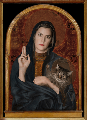 “El octavo es Elaine con su gato Loki Lucifer. Es una talentosa fotógrafa y técnica digital de aquí, de Chicago. En cuanto empezamos a hablar, supimos que debíamos enfocarlo hacia la Virgen y el Niño, y nos inclinamos por los cuadros de estilo gótico de los siglos XII y XIII”. En este caso, Gatos y Respeto se permite añadir que, en la iconografía cristiana de la época, la bendición con la mano derecha estaba reservada únicamente a Cristo.