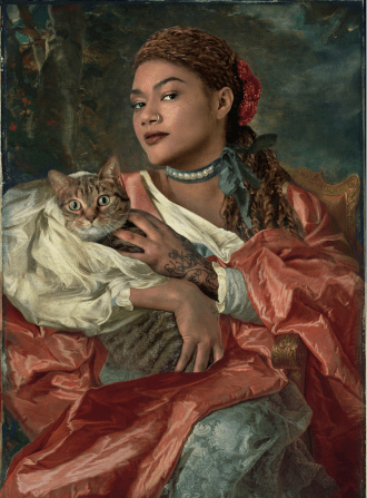 “Para Reba y Neva quería que llevara ropa voluptuoso. Reba creció en Trinidad y Tobago y es una conocida chef de un restaurante de Chicago que está muy de moda. Viste de una manera muy informal, por eso me hacía mucha gracia cambiarle completamente el estilo y basarme en los retratos coloniales miniaturistas. Hice varias pruebas, pero creo que este es el definitivo”. La fotógrafa se refiere a Reba con el vestido azul y no hemos encontrado ningún retrato que pueda servir de modelo.